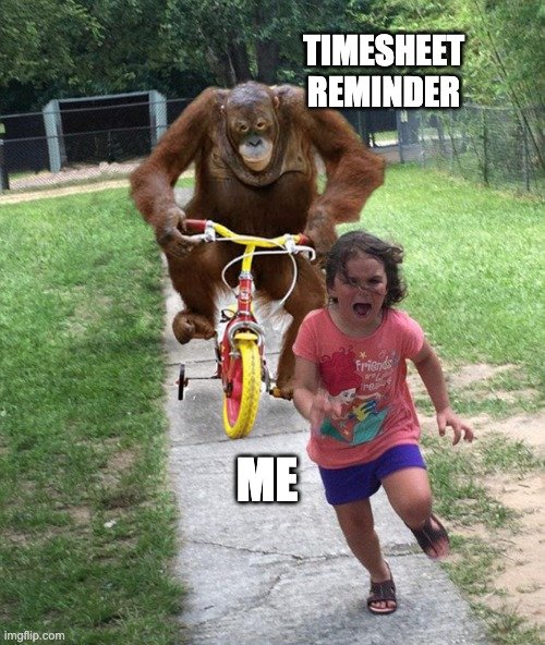 Then we have the 'Timesheet Reminder Chase' meme. Every manager has experienced this—keeping projects on track remotely when—WHAM—a missing timesheet pops up, like an orangutan chasing down deadlines. The panic is real, and it’s your problem to solve.