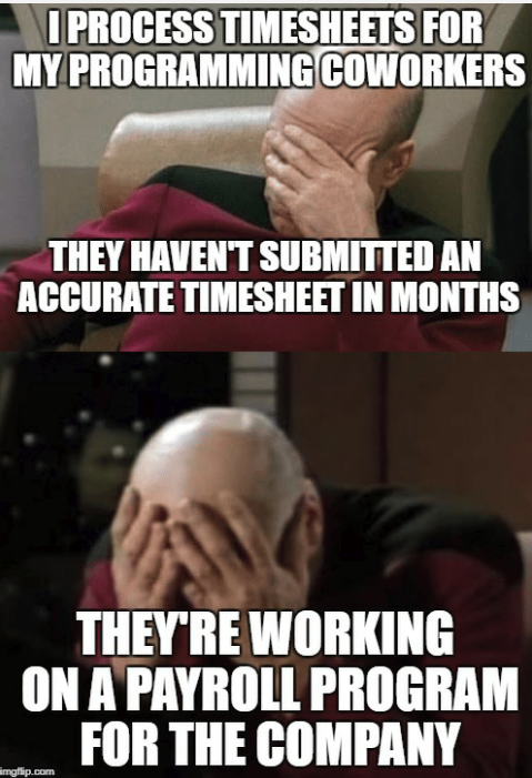 Getting employees to submit timesheets accurately—and on time—is a familiar challenge for employers. This facepalming meme is something every manager can relate to. Your star programmer who can write code like a machine? Still can't seem to submit a correct timesheet.