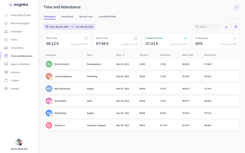 By automating clock-ins and outs, and tracking time spent on activities and projects, Insightful eliminates the need for manual time tracking or timesheets.